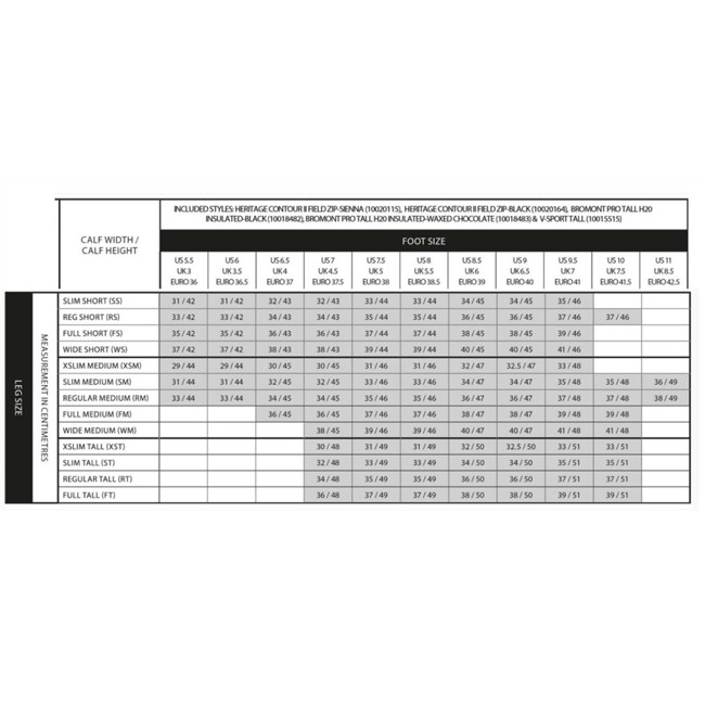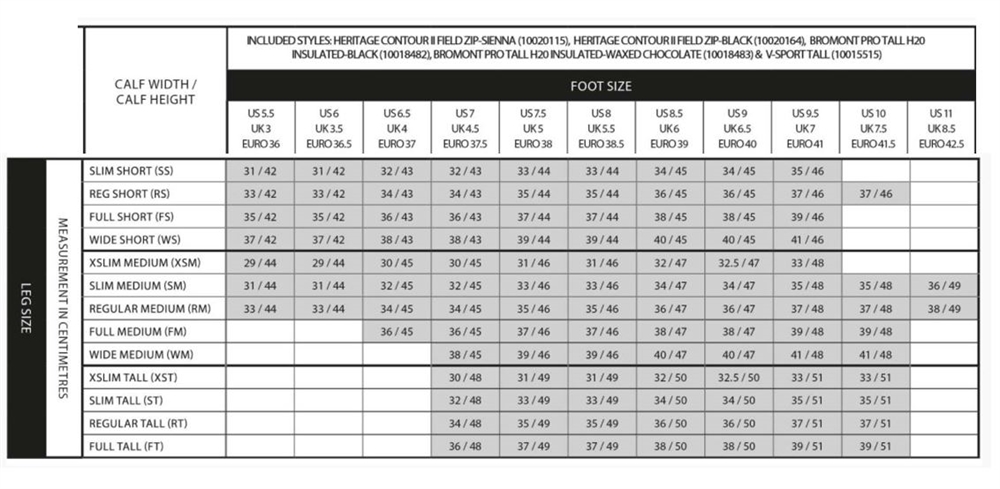 Siehe Größentabelle für Maße der Wadenbreite und Höhe.