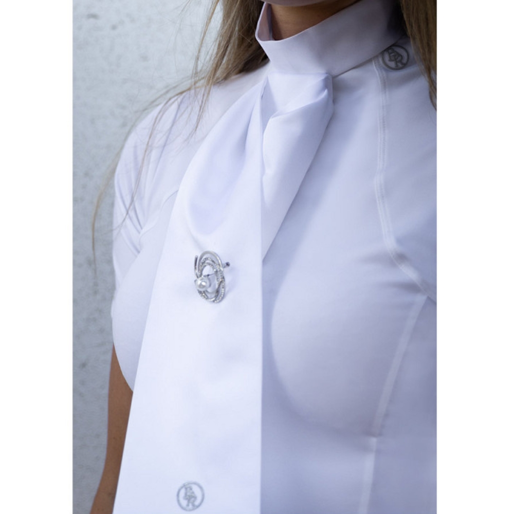 Elegante Plastronnadel, die das Turnieroutfit stilvoll vervollständigt. Die Nadel ist mit funkelnden Strasssteinen und einer schönen Perle in der Mitte verziert, was einen anspruchsvollen und luxuriösen Ausdruck verleiht. Perfekt für sowohl Dressur- als auch Springturniere.