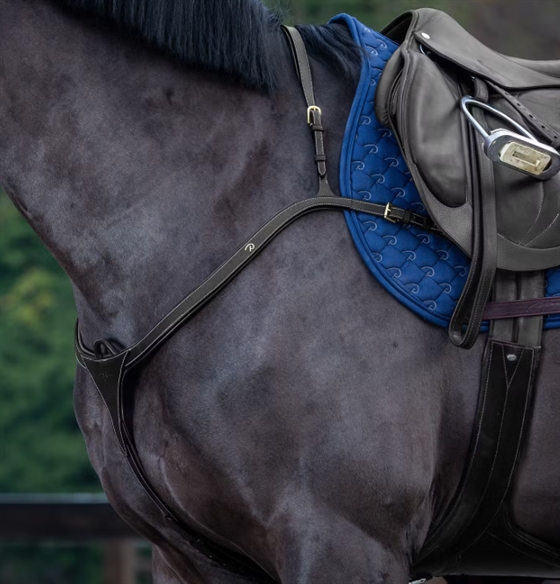 Dyon Long Bridge ist ein elegantes und schlichtes Vorderzeug, das anatomisch geformt ist, um maximale Schulterfreiheit zu gewährleisten. Das Vorderzeug ist aus weichem, feinem spanischem Leder gefertigt und verfügt über robuste Stahlschnallen sowie dekorative weiße Kontrastnähte, die für eine stilvolle Optik sorgen. Das glatte Design macht es für das Pferd angenehm und im täglichen Reiten einfach in der Anwendung.