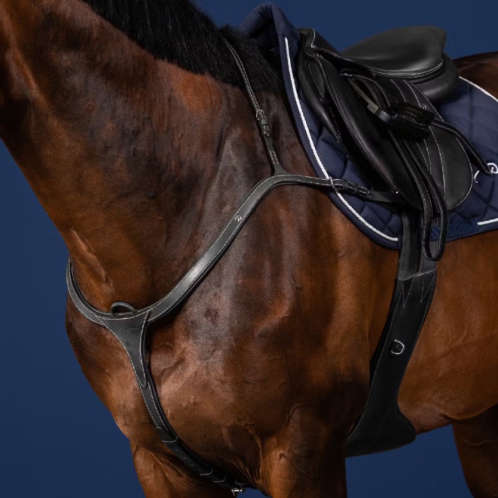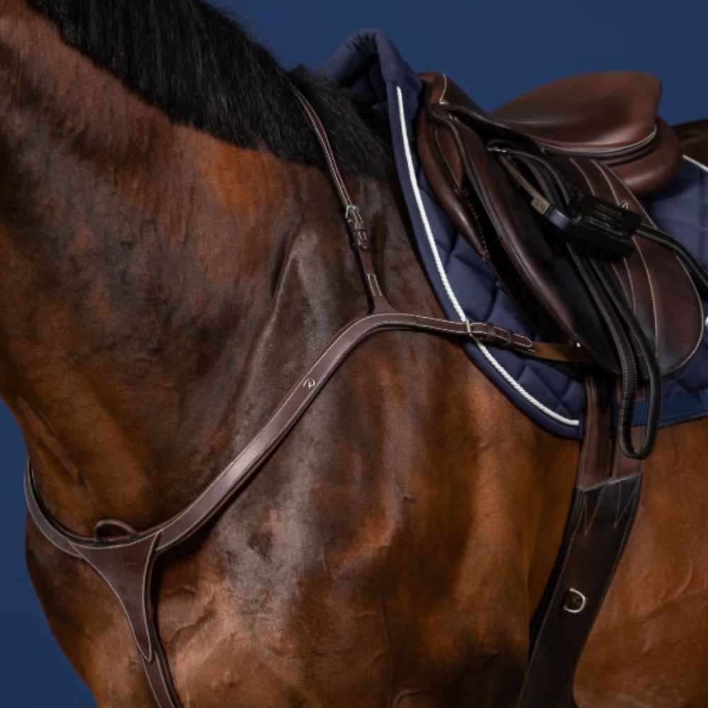 Dyon Long Bridge ist ein elegantes und schlichtes Vorderzeug, das anatomisch geformt ist, um maximale Schulterfreiheit zu gewährleisten. Das Vorderzeug ist aus weichem, feinem spanischem Leder gefertigt und verfügt über robuste Stahlschnallen sowie dekorative weiße Kontrastnähte, die für eine stilvolle Optik sorgen. Das glatte Design macht es für das Pferd angenehm und für den täglichen Einsatz beim Reiten einfach in der Handhabung.