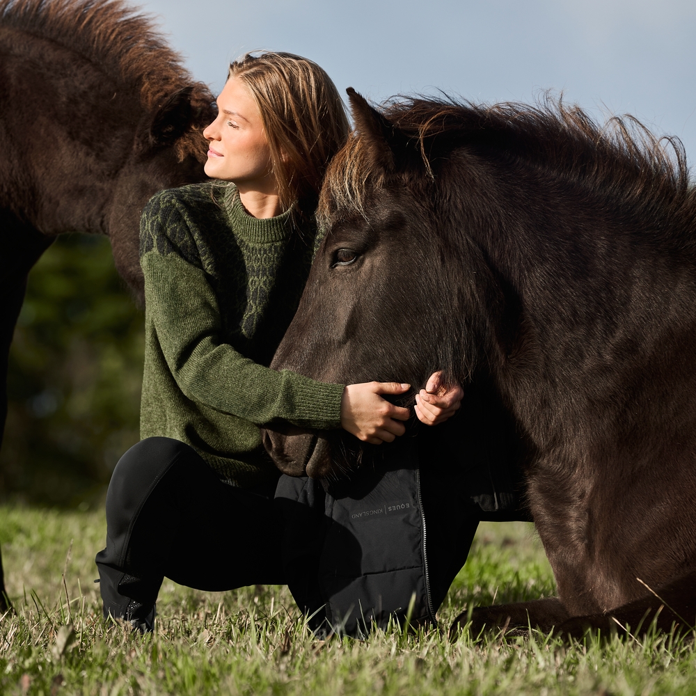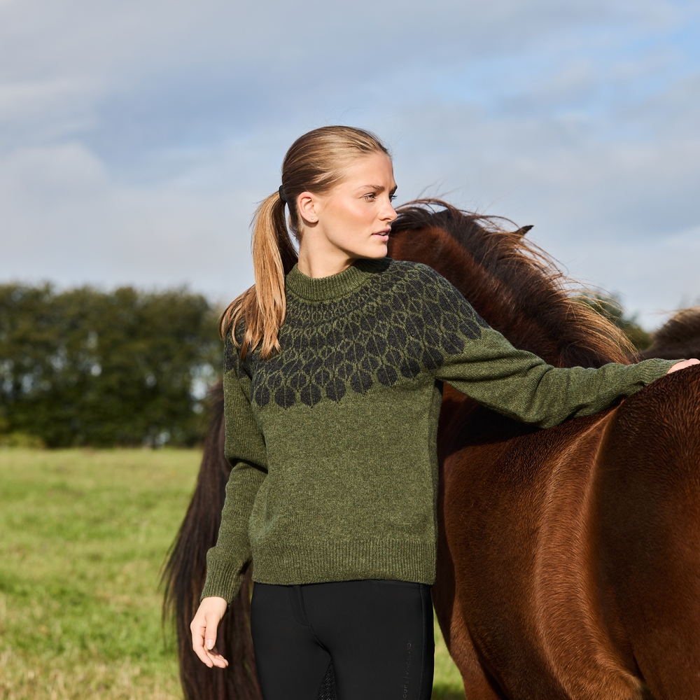 EQUES|KINGSLAND Magda Sweater kombiniert ein isländisch inspiriertes Muster mit modernem Stil und Wärme. Er ist ideal als Zwischenschicht zum Reiten und für Outdoor-Aktivitäten und vereint Tradition mit zeitgemäßem Komfort und Eleganz.