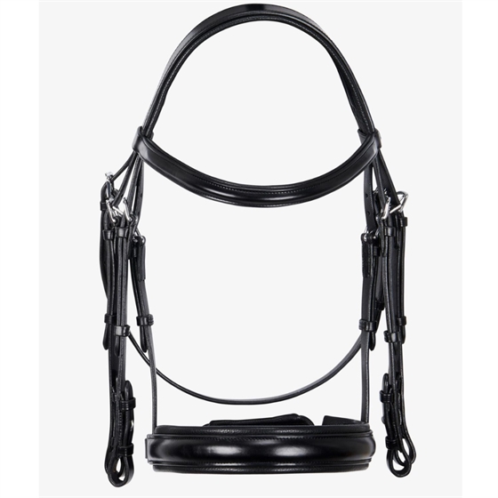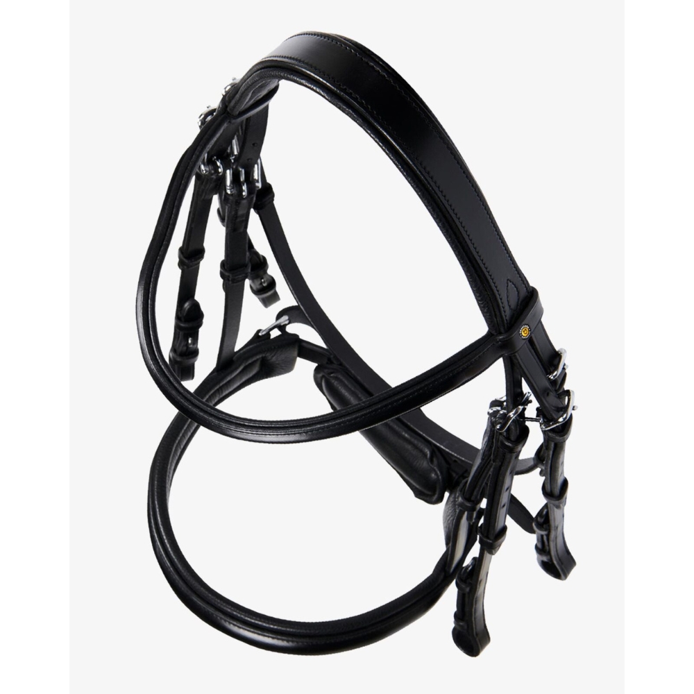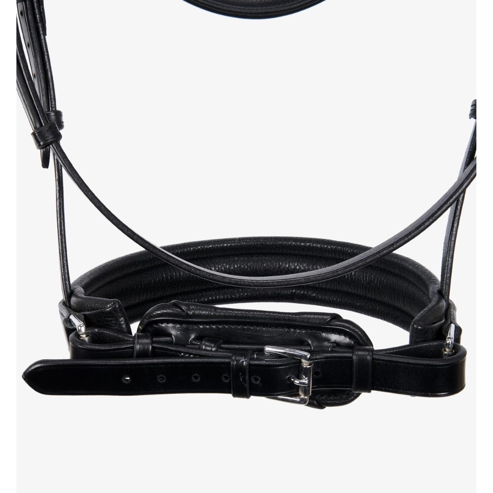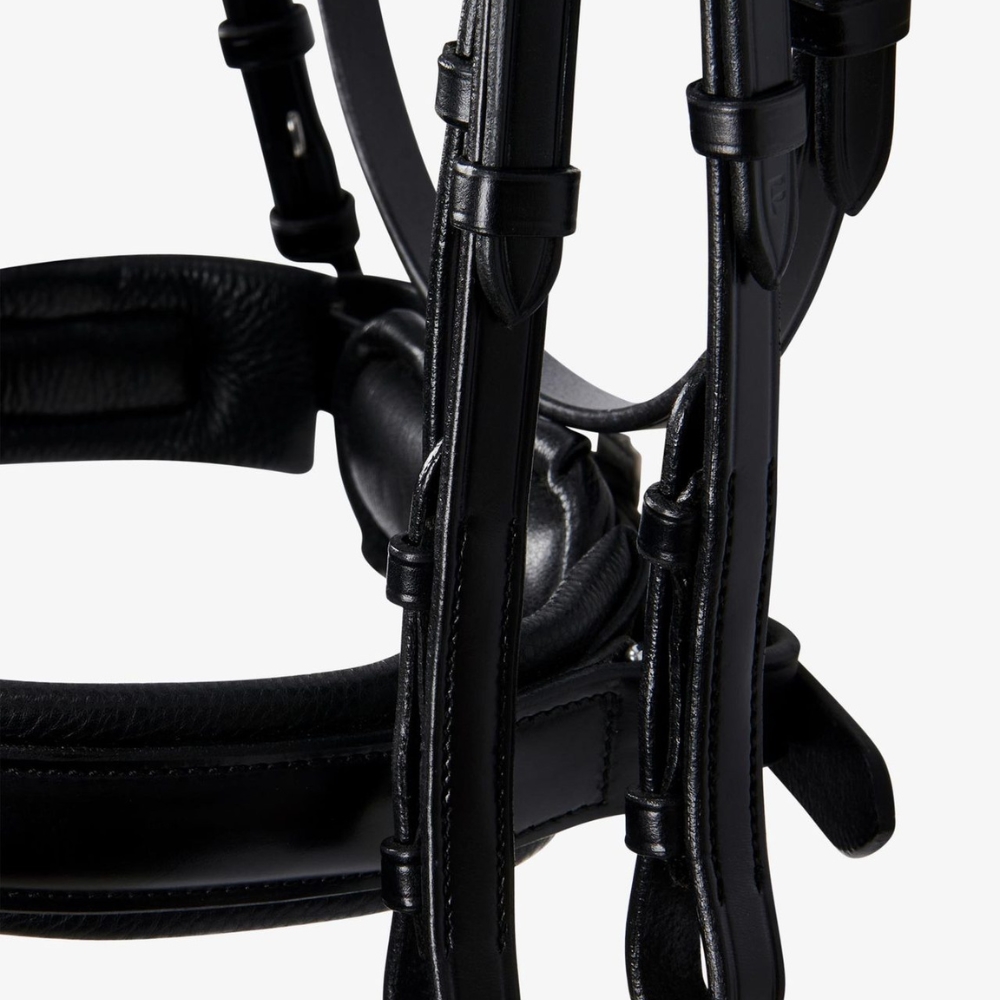 Das anatomisch geformte Genickstück ist so gestaltet, dass es den Druck gleichmäßig über einen größeren Bereich in der empfindlichsten Zone des Genicks verteilt, was den Komfort des Pferdes erhöht. Das Nasenband ist mit einem Pull-Back-Verschluss ausgestattet, der auf einer gepolsterten und abnehmbaren Schutzklappe montiert ist, die eine einfache und schonende Anpassung gewährleistet.