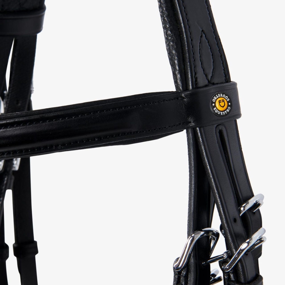 Sowohl der Kinnriemen als auch der Verschluss am Maul sind verstellbar, sodass die Trense perfekt an das einzelne Pferd angepasst werden kann. Die Kandare ist mit rostfreien Stahlschnallen ausgestattet, die hohe Stabilität, Sicherheit und Langlebigkeit bieten. Das gepolsterte Stirnband ist elegant mit einer Metallplatte mit Equestro-Logo verziert.