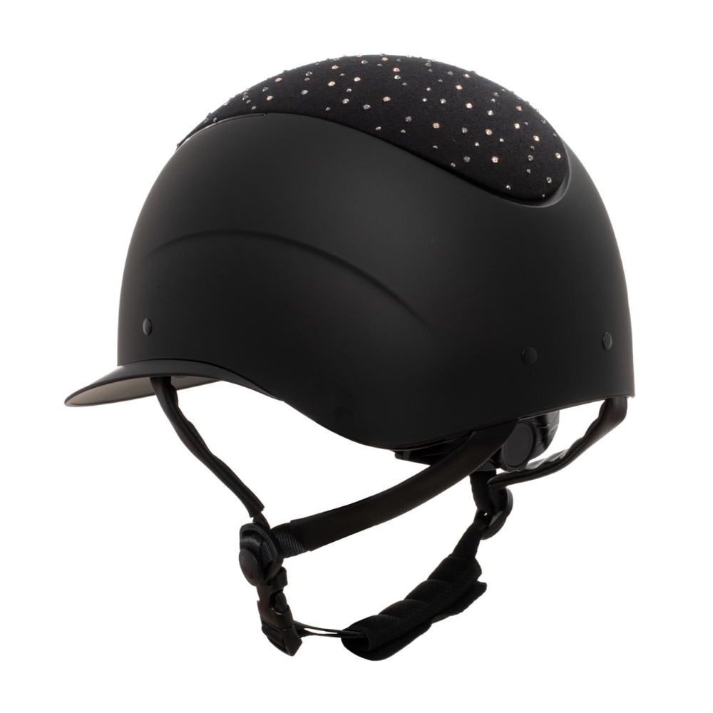 Die matte Außenschale ist mit funkelnden Strasssteinen verziert, die das ikonische Equestro-Logo um die vorderen Belüftungsöffnungen bilden. Zusammen mit dem glänzenden Rahmen erhält der Helm einen luxuriösen und raffinierten Ausdruck – perfekt für Reiter, die Sicherheit mit Stil kombinieren möchten.