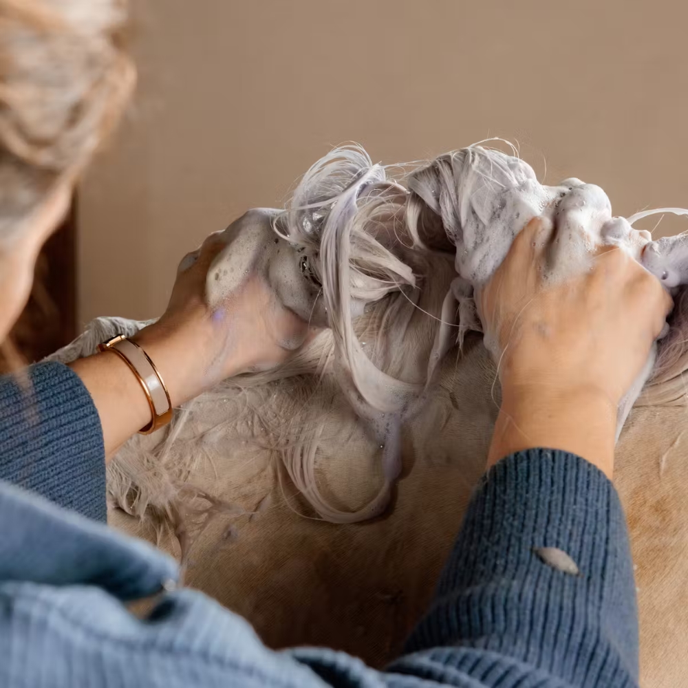 Das Fell des Pferdes gründlich mit Wasser anfeuchten. Shampoo direkt auf das Fell auftragen und einmassieren, bis ein reichhaltiger Schaum entsteht. Bei hartnäckigen Flecken kann das Shampoo unverdünnt auf die betroffenen Stellen aufgetragen werden. Gründlich ausspülen, am besten mit lauwarmem Wasser.