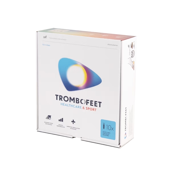 Trombofeet ist eine orale Huf-Support-Paste, die entwickelt wurde, um das physiologische Gleichgewicht des Hufs während der Leistung zu unterstützen. Wenn sich die Blutgefäße bei der Arbeit erweitern, kann der Druck im Huf ansteigen und Komfort sowie Stabilität beeinflussen. Trombofeet hilft, dieses „Druckgefühl“ zu reduzieren, indem es die Durchblutung des Hufs und den allgemeinen Komfort vor, während und nach intensivem Training oder Wettkampf unterstützt.