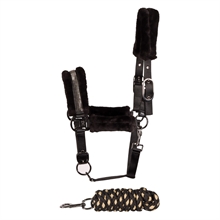 Das Halfter ist mit glänzenden Details am Nasenriemen verziert und hat weiches Kunstfell an Nasen-, Wangen- und Nackenstücken für maximalen Komfort.