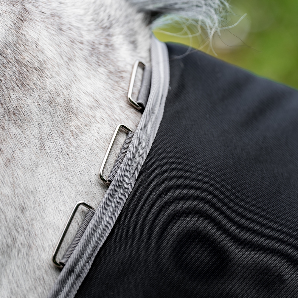Das Material besteht aus robustem 1200 Denier Polyester, das einen starken, wasserdichten und atmungsaktiven Schutz bietet. Das glatte Nylonfutter reduziert die Reibung, sodass die Decke leicht über das Fell gleitet und es vor Abnutzung schützt, während es das Fell glänzend und schön hält.