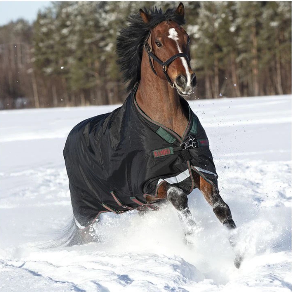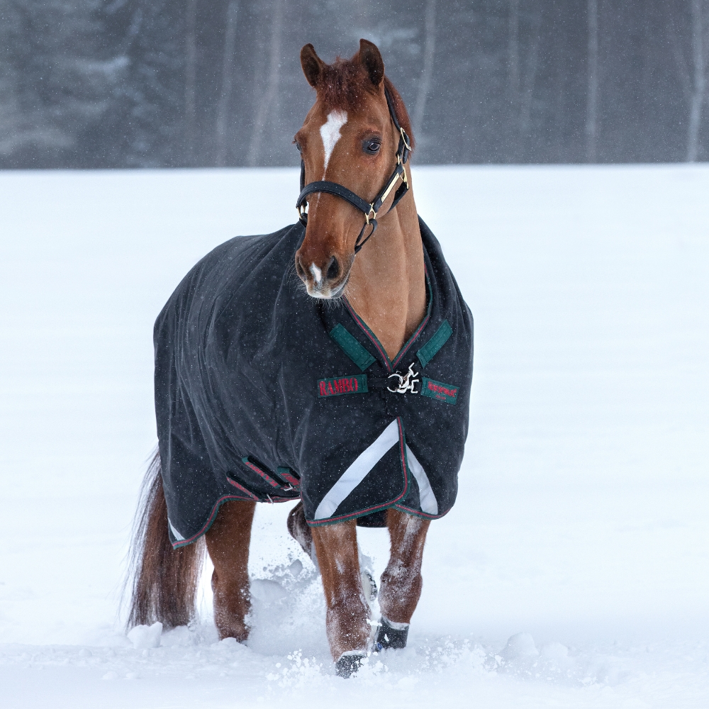 Rambo Wug 400 gram ist eine der zuverlässigsten Decken von Horseware für kühle Herbst- und Wintertage. Es ist aus ultrastarkem 1000 Denier Ballistic Nylon gefertigt, das für seine extreme Haltbarkeit, Wasserdichtigkeit und Reißfestigkeit bekannt ist. Der charakteristische halbhohe Wug-Hals bietet zusätzlichen Schutz vor Wind und Wetter – ohne Druck auf den Widerrist.