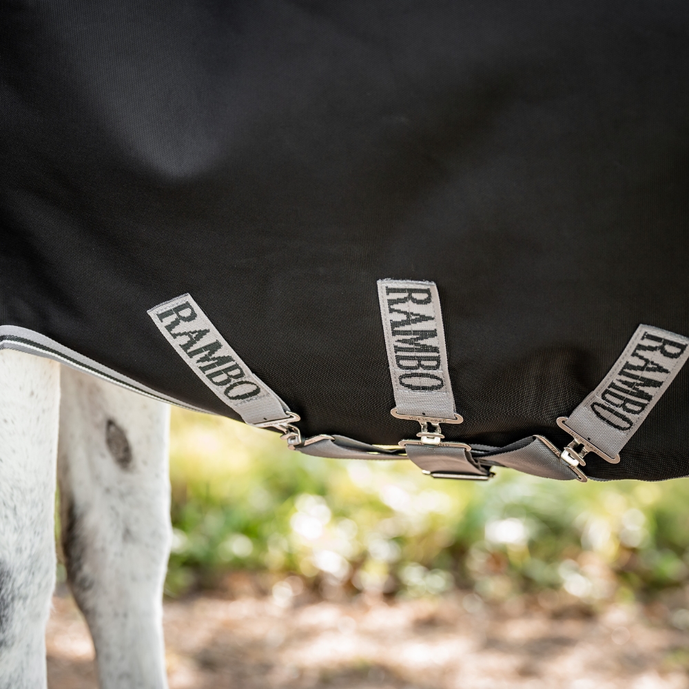 Rambos bekanntes Qualitäts-Pferdedecken aus super starkem 1000 Dn. ballistischem Nylon mit halbhohem Hals und 200 Gramm Füllung sowie Nylonfutter, um Abnutzung an der Brust des Pferdes zu verhindern.