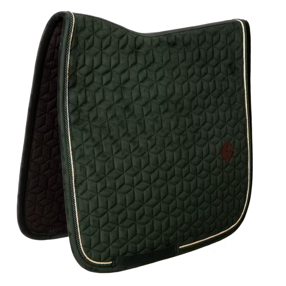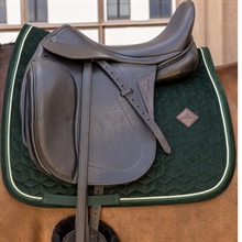Exklusive Dressurschabracke von Kentucky. Die Schabracke besteht aus einem wunderbaren Material und hat einen klassischen Look. Die Schabracke hat keine Schlaufen zur Befestigung am Sattel, sondern nur Nylonschlaufen, um den Gurt in Position zu halten. Die Schabracke hat ein schönes Logo aus Kunstleder, das höher als normal platziert ist, um Platz für eventuelles Stickereien zu lassen. Die Schabracke ist bei 30° in der Maschine waschbar und darf nicht im Trockner getrocknet werden. Erhältlich in Größe: Full Erhältlich in Farbe: Emerald - Grey - Black - Beige - Bordeaux - Purple - Light Blue - Old Rose