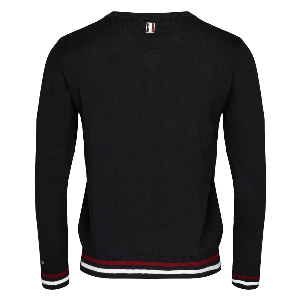 Der Pullover hat Kontraststreifen an den Ärmelenden sowie am Saum.