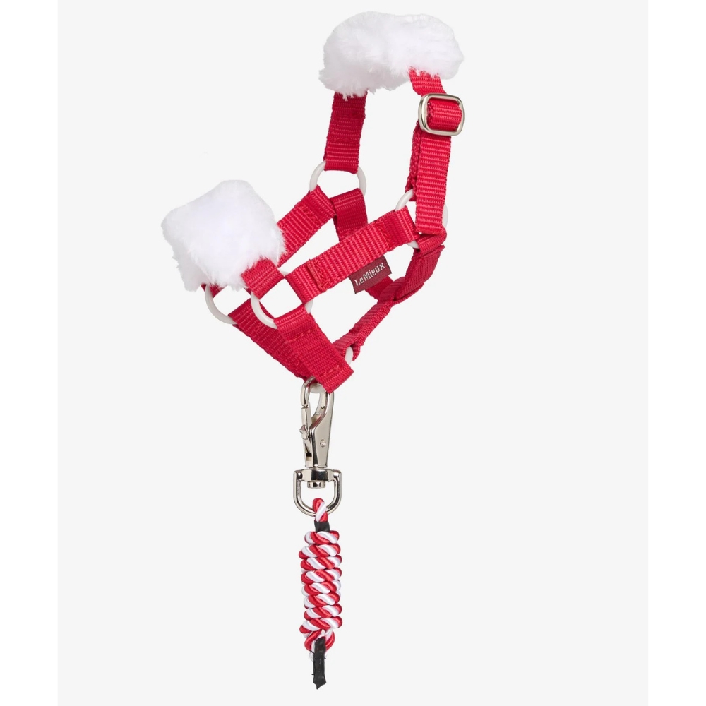 Das Halfter hat eine weiche Fleecepolsterung an Nase und Genickstück, einen verstellbaren Riemen sowie ein detailliert gesticktes LeMieux-Logo. Das Set wird komplett mit einem passenden Führstrick geliefert – genau wie das echte Produkt.