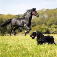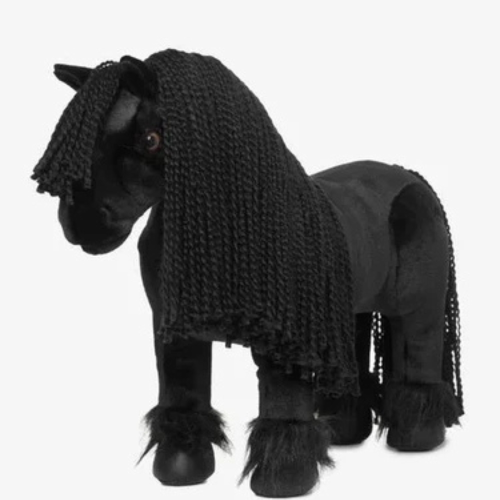 • Realistisches Friesen-Design – lange, flechtbare Mähne und Schweif, schwarzer Fesselbehang.