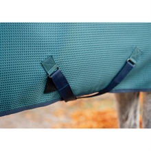 Die Decke ist aus 100 % Waffelgewebe-Polyester gefertigt, wobei die spezielle strukturierte Oberfläche Feuchtigkeit effektiv vom Pferdekörper ableitet. Dies sorgt für eine schnellere Trocknungszeit und verhindert, dass das Pferd auskühlt.
