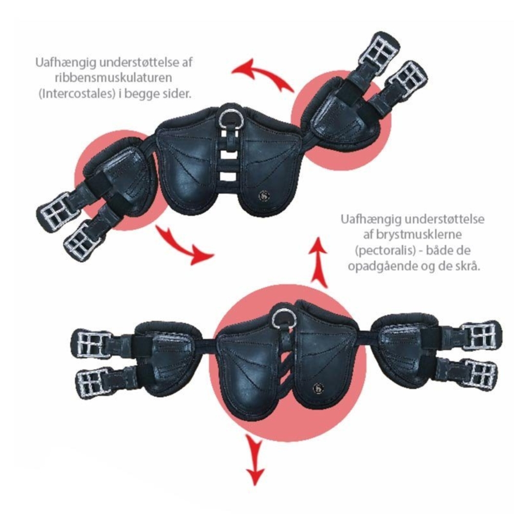 SCHARF FREEDOM Dressurgurt ist mit dem Fokus auf die Anatomie des Pferdes entwickelt worden und repräsentiert ein bahnbrechendes Konzept im Gurtdesign. Der Gurt bietet unabhängige Unterstützung der Rippenmuskulatur auf beiden Seiten sowie optimale Unterstützung für sowohl die aufsteigenden als auch die schrägen Brustmuskeln.