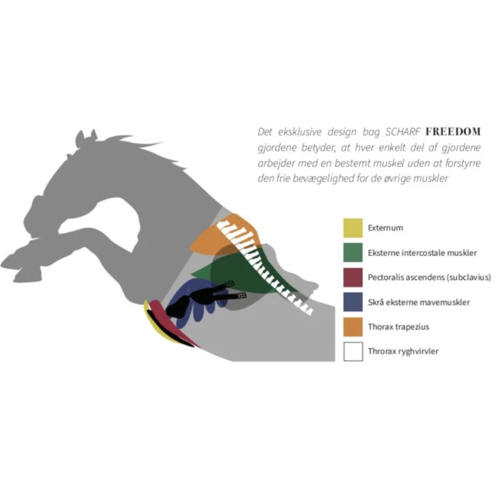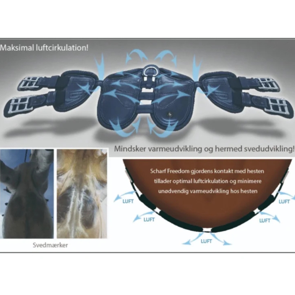 Scharf Freedom ist der einzige Gurt auf dem Markt, der in allen Gelenken 100 % flexibel und beweglich ist. Die innovative Konstruktion bedeutet zudem weniger Kontaktpunkte, was dem Pferd eine bessere Möglichkeit gibt, Schweiß im Gurtbereich abzuleiten. Der Gurt ist leicht und praktisch im Alltag und kann einfach zusammengeklappt werden.
