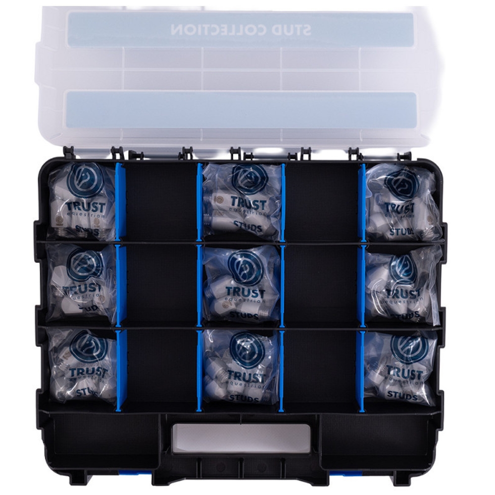 TRUST Stud Box Collection bietet dem Reiter ein vollständiges und professionelles Stollen-Set, damit du für Training und Turnier immer bereit bist – unabhängig vom Boden. Precision, Performance und Zuverlässigkeit in einer Box vereint.