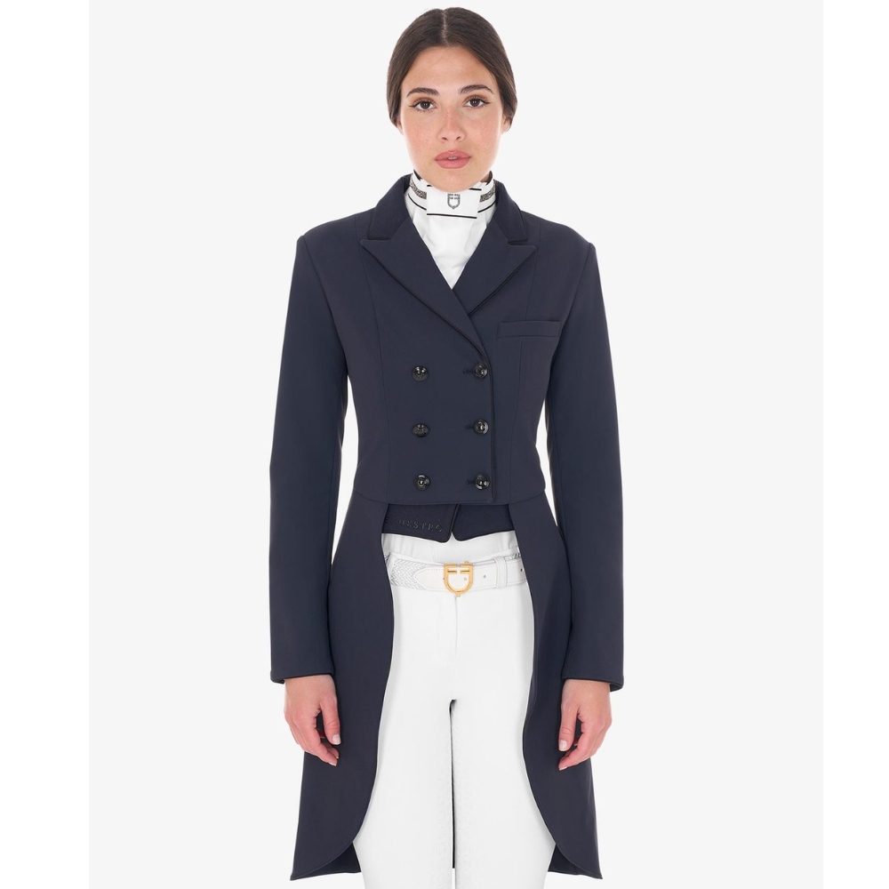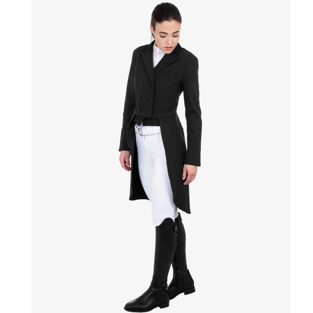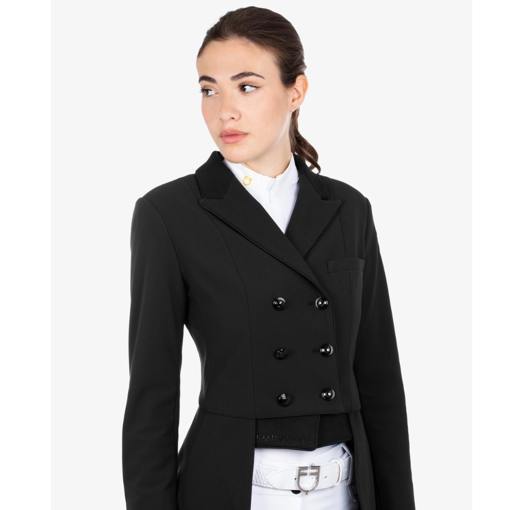 Elegante Dressurkjole für Damen von Equestro, hergestellt aus einem atmungsaktiven und bi-elastischen technischen Material, das maximale Bewegungsfreiheit und Komfort beim Reiten gewährleistet.